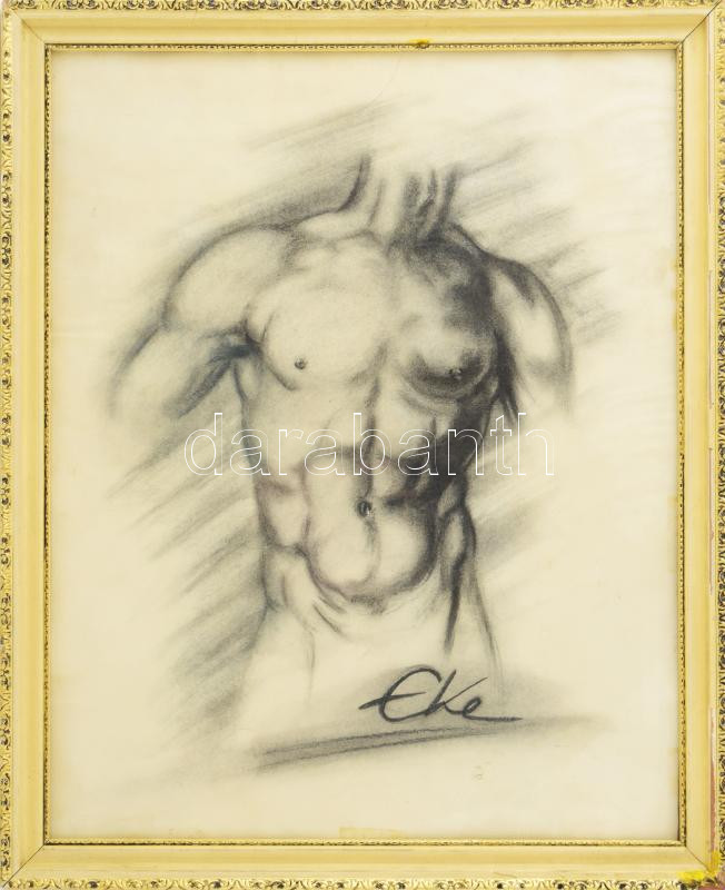 Leírás: Eke Zsolt (1968-2005): Férfi akt tanulmány, szén, papír, jelzett. Dekoratív, üvegezett, sérült fakeretben, 51,5x41 cm