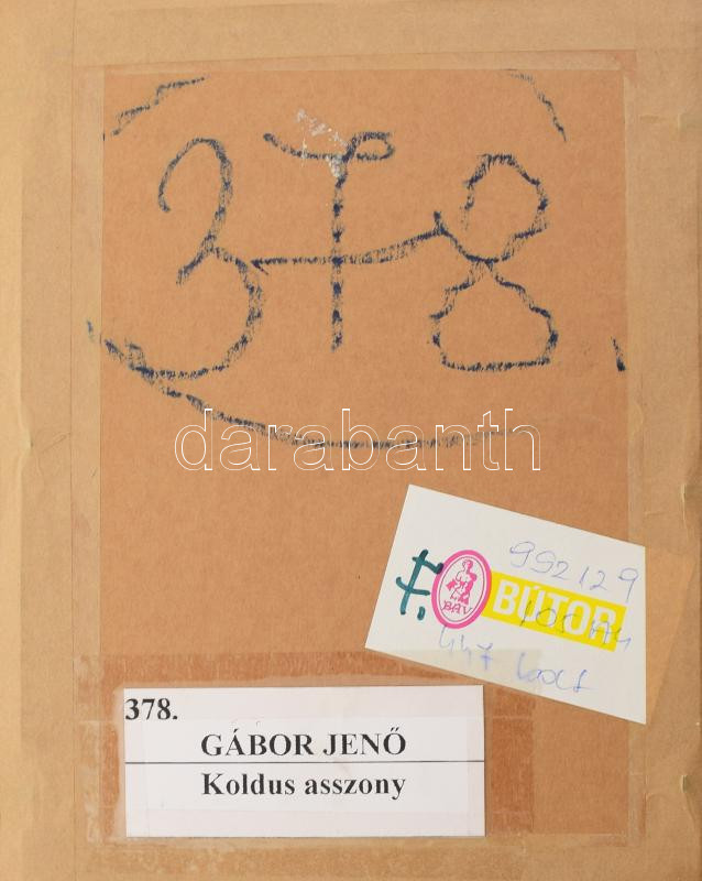 Leírás: Gábor Jenő (1893-1968): Koldus asszony, 1945. Akvarell, papír, jelezve jobbra lent. Aukcionálva: BÁV Rt. 52. Ékszer Aukció/105. Festmény Aukció, Műtárgy Aukció/4. Néprajzi Aukció - Tavaszi aukció, 2000, 378. tétel. Hátoldalán BÁV raglapokkal. Dekoratív, kissé kopott fakeretben. 20x13,5 cm