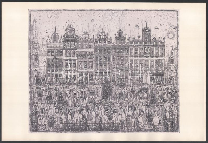Leírás: Gross Arnold (1929-2015): Brüsszeli vasárnap. Ofszet nyomat, papír, jelzett a nyomaton. Az 1973-ban megjelent Corvina mappából. 25x30 cm.