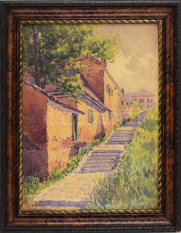 Leírás: Haeffner Jenőv (1894-1944): Tabáni lépcső, 1928. Akvarell, papír, jelezve jobbra lent. Dekoratív, korabeli üvegezett fakeretben. 39x29 cm