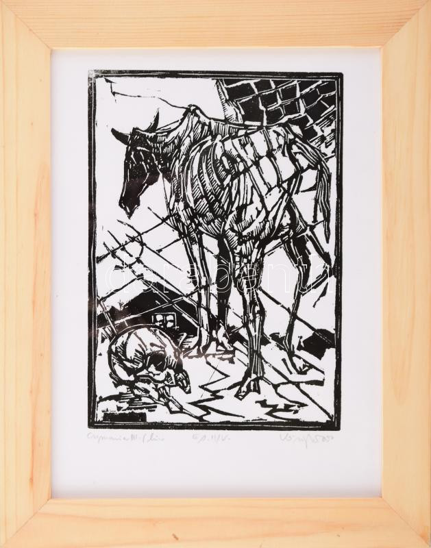 König (Kőnig) Róbert (1951-2014): Cumania III. Linómetszet, papír, jelzett, művészpéldány EA. II./V. számozással, plexiüvegezett fakeretben, 18x12,5 cm