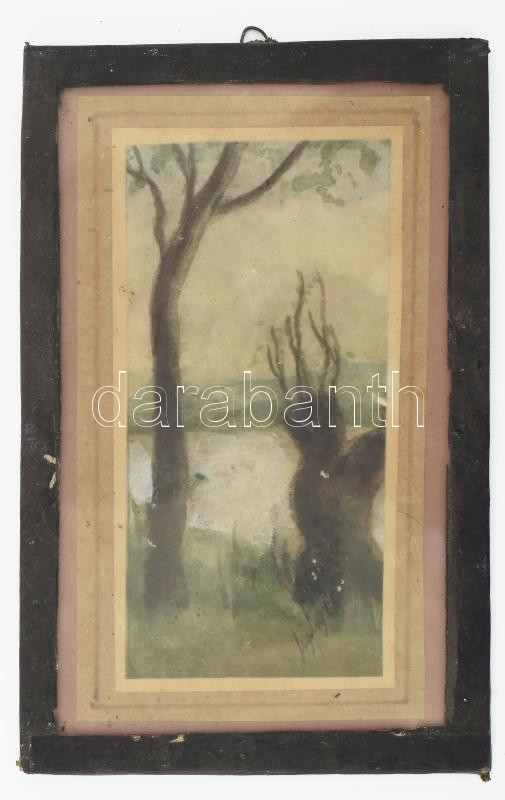 Leírás: Nyáregyházi báró Nyáry Pál (?-?): Vízparti fák. Akvarell, papír. Jelezve jobbra lent. Üveg mögött. 11x5,5 cm