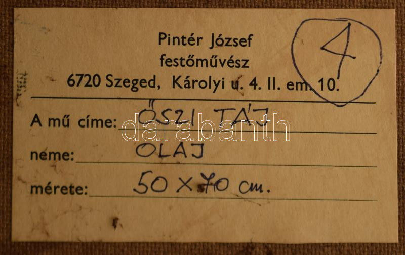 Pintér József (1922-2002): Őszi táj. Olaj, farost. Jelzett. 50x70 cm F... https://www.darabanth.com/hu/477-Gyorsarveres/477.0/Festmenyek-es-grafikak/Festmenyek-es-grafikak~1000011/Pinter-Jozsef-1922-2002-Oszi-taj-Olaj-farost-Jelzett-50x70-cm-Fakeretben~II3251006