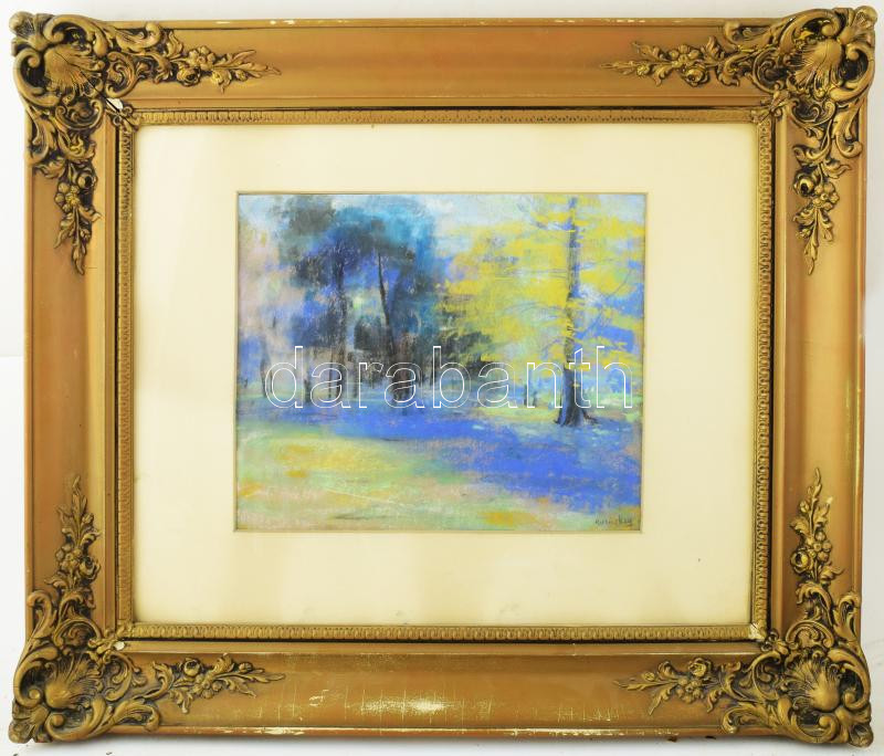 Leírás: Ruzicskay György (1896-1993): Őszi táj. Pasztell, papír, jelezve jobbra lent, hátoldalán 1950-60 körüli címkén feliratozott. Dekoratív, üvegezett, kissé sérült fakeretben, 26,5×32 cm