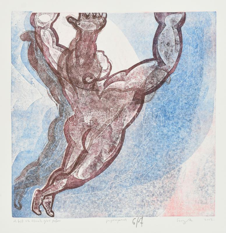 Leírás: Szalay Miklós (1972-): A hit az észnek járó pofon, 2002. Papírnyomat, papír, jelzett, 6/7 számozással. 20x20 cm