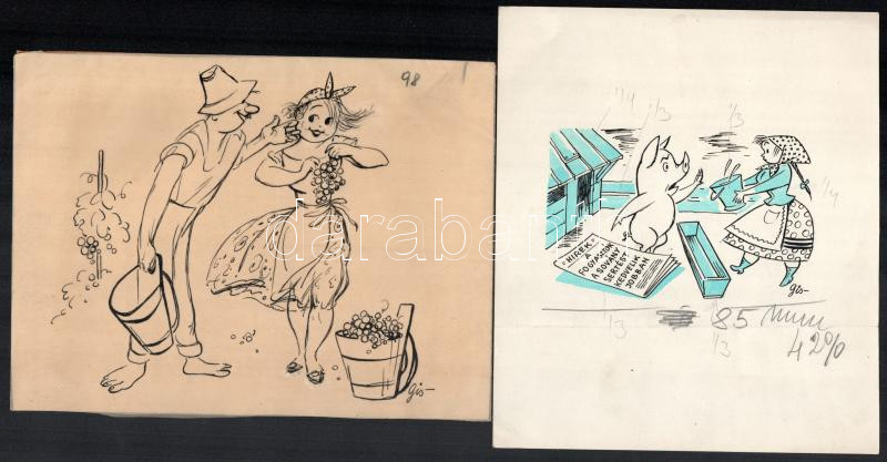 Szegő Gizi (1902-1985): 10 db karikatúra. Vegyes technika, papír, jelzett és egy kivételével hátoldalán "Ludas Matyi" bélyegzővel. 12x16 és 16x21 cm közötti méretekben.