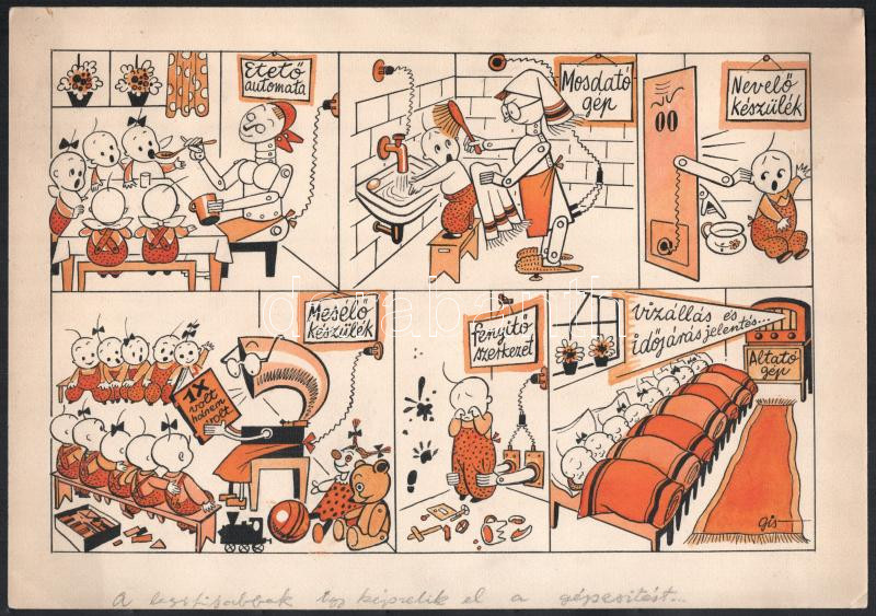 Szegő Gizi (1902-1985): A legifjabbak így képzelik el a gépesítést... (karikatúra). Tus, akvarell, papír, jelzett és hátoldalán "Ludas Matyi Szerkesztősége" bélyegzővel. 21x30 cm