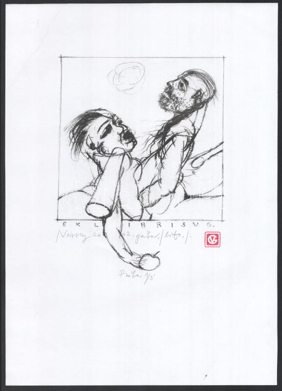 Leírás: Véssey Gábor (1948-): Ex libris V.G., 2002. Litográfia, papír, jelzett, próbanyomat 1/3 számozással, 19,5×15 cm