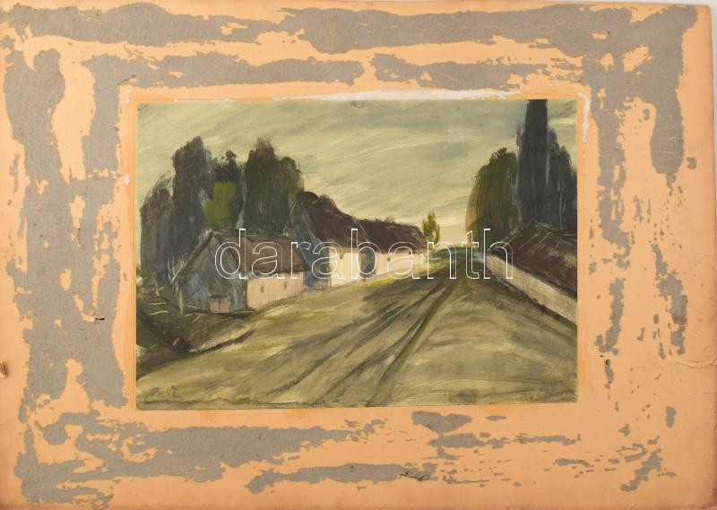 Leírás: Zajti Ferenc (1886-1961): Utcarészlet. Akvarell, papír, jelzett, kartonra kasírozva, karton hátoldalán kissé töredékes viaszpecséttel. Karton sérült. 30×42 cm