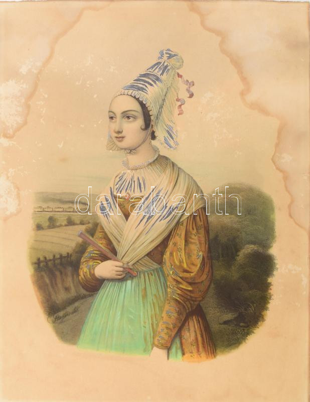Leírás: Singer jelzéssel, XIX. sz. közepe/vége: Divatos hölgy tájban, háttérben száguldó vonat. Színezett litográfia, papír, foltos. 34x26,5 cm