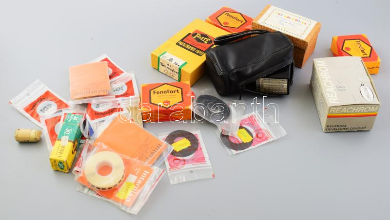 Leírás: Fotós kellékek: bontatlan fotópapír, filmelőhívó készlet, szűrők, filmek, ragasztók, stb, eredeti csomagolásban + egy vaku