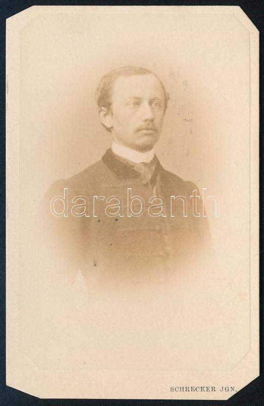 1865 Schvarcz Gyula (1839-1900) államtudományi író, történész, jogtörténész, művelődéspolitikus, országgyűlési képviselő, az MTA tagja; vizitkártya Schrecker Ignác (1834-1888) pesti műterméből, sarkai vágottak, 9,5x6 cm