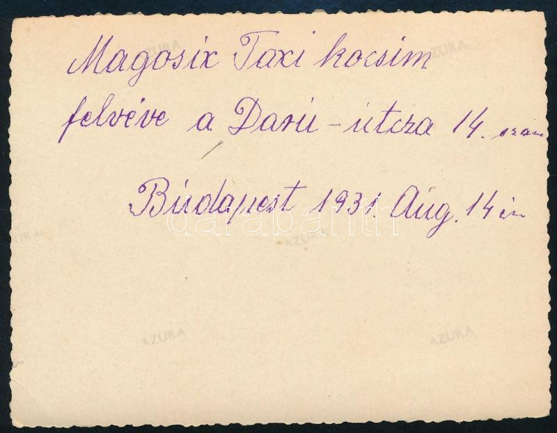 Leírás: 1931 Bp., Daru u. 14. szám előtt álló Magosix taxi, a hátoldalon feliratozott fotó, 11,5x8,5 cm