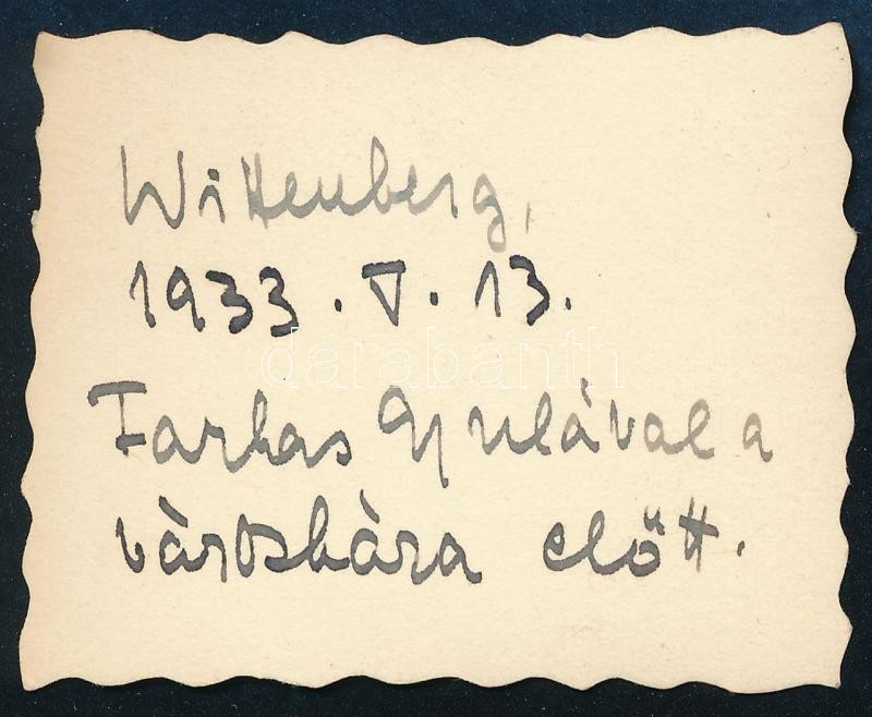 1933 Wittenberg, Farkas Gyula (1894-1958) irodalomtörténész, a berlini Collegium Hungaricum igazgatója és az egyetemi Hungarológiai Intézet vezetője valamint Keresztury Dezső első felesége, Seiber Mária a városháza előtt. Jelzés nélküli fotó, hátoldalán Seiber Mária által feliratozott, 5x4 cm