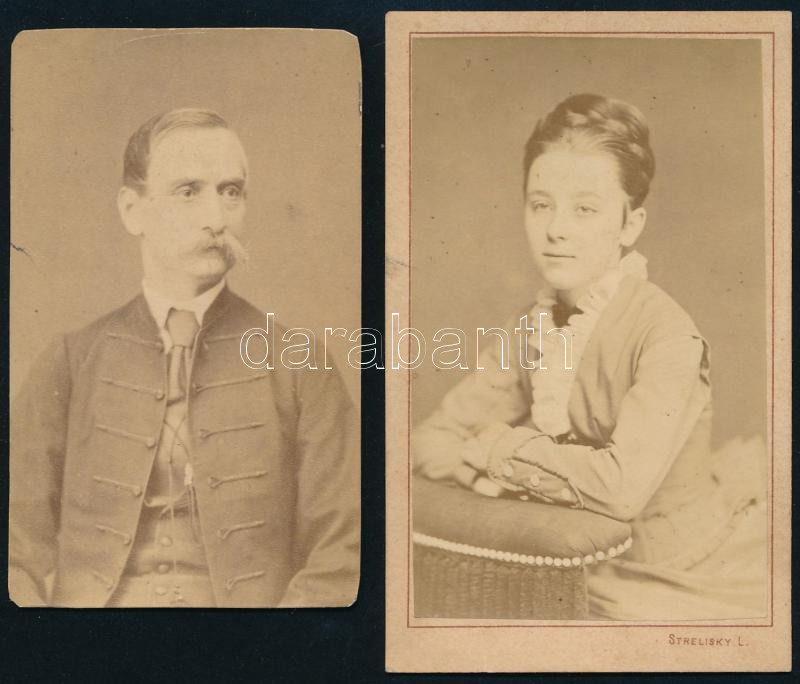 Leírás: cca 1880 Kedves Istvánné és Kedves Alajos, 2 db keményhátú fotó, 9×5,5 és 10,5×6,5 cm