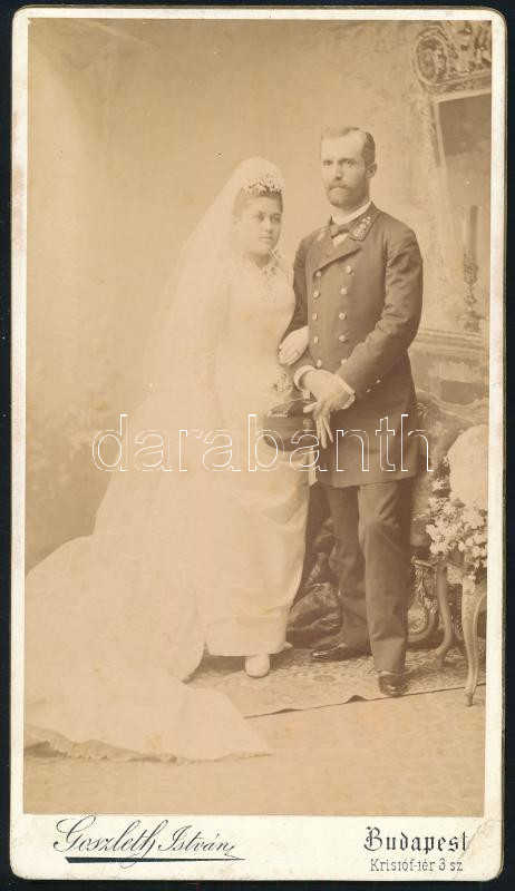 cca 1887-1890 Nyirő Gábor, kereskedelmi tengerészhadnagy, később révkapitány és a fiumei révkapitányság főnöke, hajózási főfelügyelő egyenruhában és neje, Kosutány Margit esküvői portréja, keményhátú fotó Goszleth István budapesti műterméből, 20,5×11,5 cm