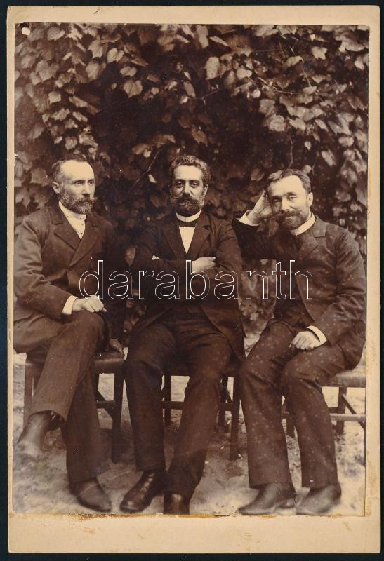cca 1890-1900 Kosutány család tagjai, 3 testvér csoportképe: Kosutány Tamás (1848-1915) agrokémikus, mezőgazdasági szakíró; Kosutány Géza (1841-1908) királyi ítélőtáblai bíró és Kosutány Ignác (1851-1940) jogász, egyetemi tanár, később a kolozsvári egyetem rektora, jelzés nélküli keményhátú fotó, 16×11 cm