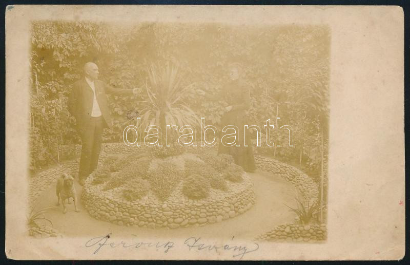 Leírás: cca 1900-1910 Férfi (Bervicz István?) és hölgy kutyával, jelzés nélküli fotólap, hátoldalán marosvásáhelyi hölgynek címezve, kissé kopott, 9x14 cm