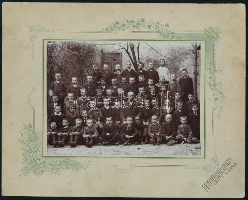 cca 1900-1910 Kassa, fiúiskola osztályának csoportképe, kartonra kasírozott fotó Cséri Henrik műterméből, a karton kissé foltos, 15,5x11,5 cm (teljes: 25x20 cm)