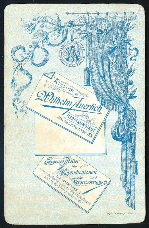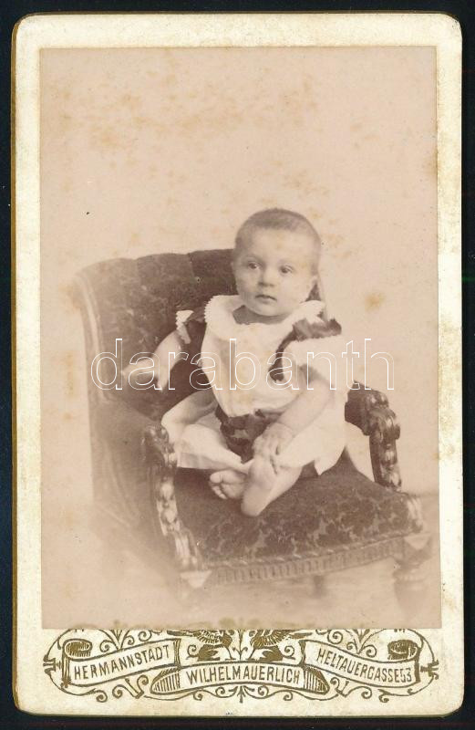 cca 1900 Csecsemő (baba) portré, keményhátú fotó Wilhelm Auerlich erdélyi (Hermannstadt/Nagyszeben) műterméből, szép verzóval, kissé kopott, 10,5×6,5 cm