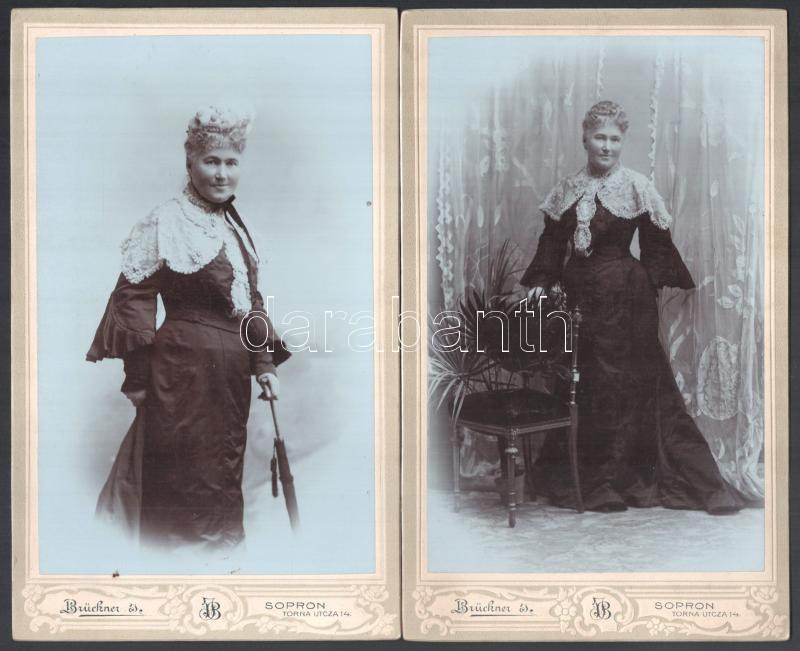Leírás: cca 1900 Előkelő, idősebb hölgy 2 db egészalakos portréja, egyiken érdekes, divatos fejfedővel, keményhátú fotók Brückner Ignác soproni műterméből, 22,5x14 cm.