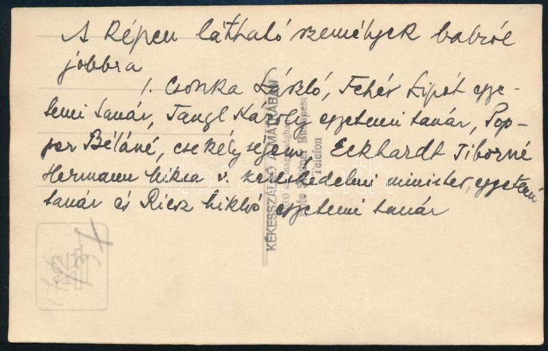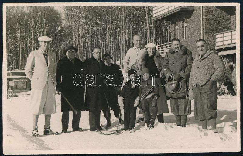cca 1930-1940 Kékes-Szálló vendégeinek fotója, feliratozva: "A képen látható személyek balról jobbra Csonka László [Csonka László (1890-1964) mérnök és építési vállalkozó, a szálló tulajdonosa], Fehér Lipót [Fejér Lipót (1880-1959) matematikus,] egyetemi tanár, Tangl Károly [Tangl Károly (1869-1940) fizikus,] egyetemi tanár, Popper Béláné, csekélységem [Matits Lajos (1902-1972) a Kékes-Szálló orvosa], Eckhardt Tiborné, Hermann Miksa [Herrmann Miksa (1868-1944) gépészmérnök] v. kereskedelmi miniszter, egyetemi tanár, és Riesz Miklós [Riesz Miklós (1919-1984) közgazdász], egyetemi tanár, fotólap, 8,5x13,5 cm