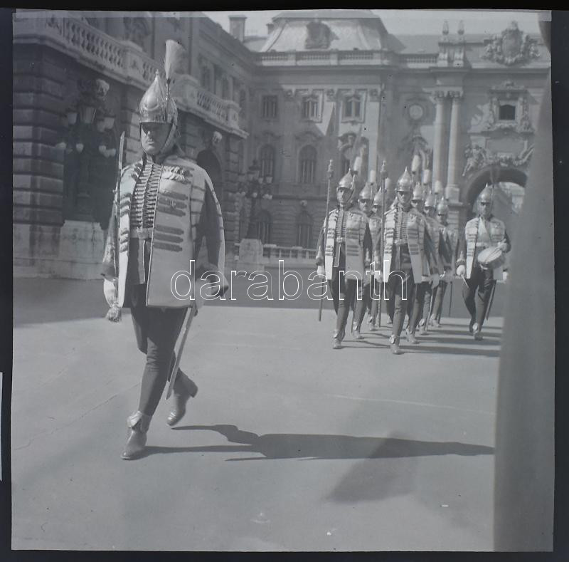 Leírás: cca 1930/40, Magyar Királyi Testőrség menetelése, élén kitüntetett személlyel, fotónegatív, 6x6 cm