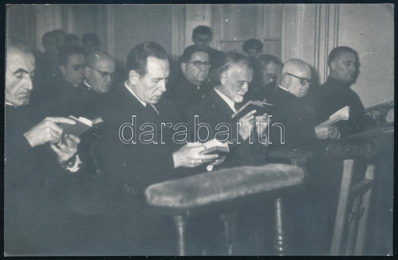 cca 1960-65 Kodály Zoltán (1882-1967), Endrédy Vendel (1895-1981) zirci apát és más beazonosítandó személyek (Sík Sándor rekviemjén?), fotó, jelzés nélkül, hátoldalán feliratozott, 9x14 cm