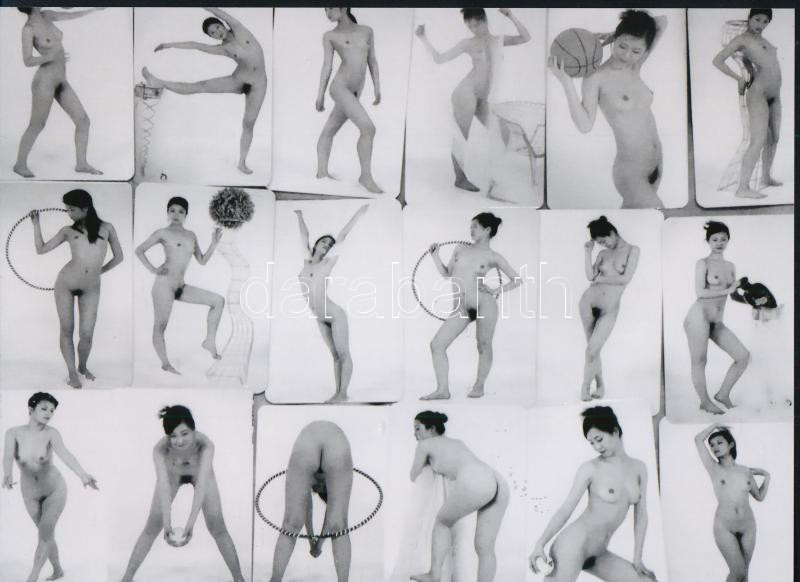 cca 1970 ,,Csiklandós felvételek egy privát kártyapakli illusztrálására", tizennyolc szolidan erotikus felvétel 1 db modern nagyításon, jelzés nélkül, 15x21 cm