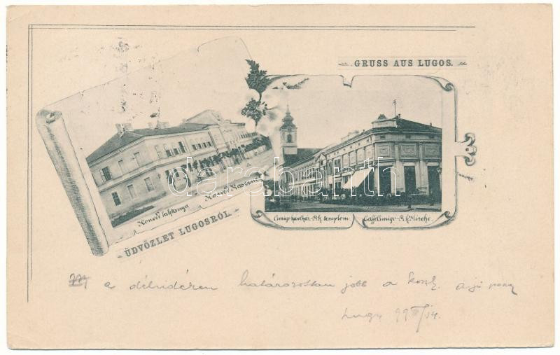 1899 (Vorläufer) Lugos, Lugoj; Honvéd laktanya, Amigo kávéház, Római katolikus templom / Honvéd-Kaserne, Caffe Amigo, R. k. Kirche / K.u.K. military barracks, café, Catholic church. Art Nouveau, floral (EK)