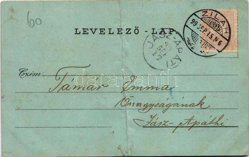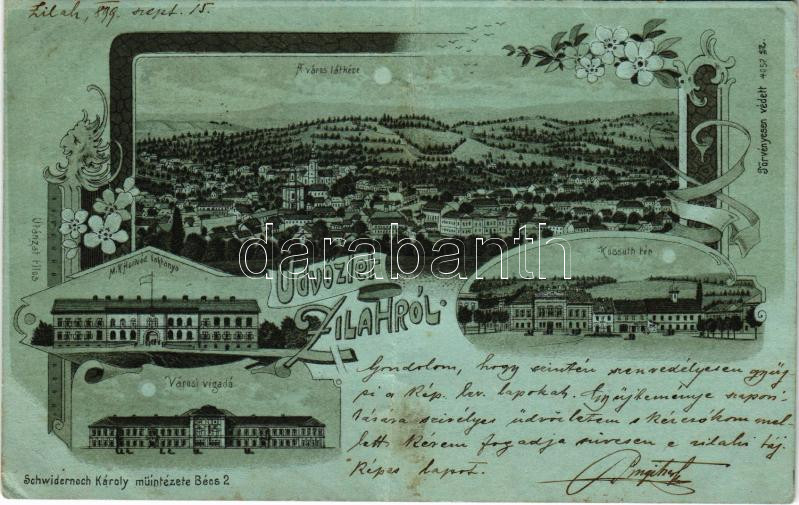1899 (Vorläufer) Zilah, Zalau; látkép, M. kir. honvéd laktanya, Kossuth tér, Városi vigadó. Schwidernoch Károly műintézete / general view, K.u.K. military barracks, square, concert hall. Art Nouveau, floral, litho (fa)
