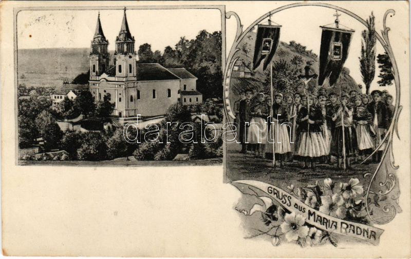 Leírás: 1911 Máriaradna, Mária-Radna, Radna (Lippa, Lipova); Kegytemplom, körmenet. Dimfeld Simon kiadása / pilgrimage church, procession. Art Nouveau, floral (fl)