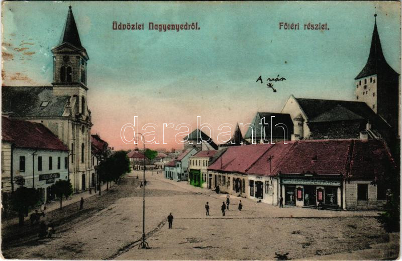 1911 Nagyenyed, Aiud; Fő tér, gyógyszertár, Református vártemplom, üzletek. Földes Ede kiadása / main square, pharmacy, Calvinist castle church, shops (Rb)