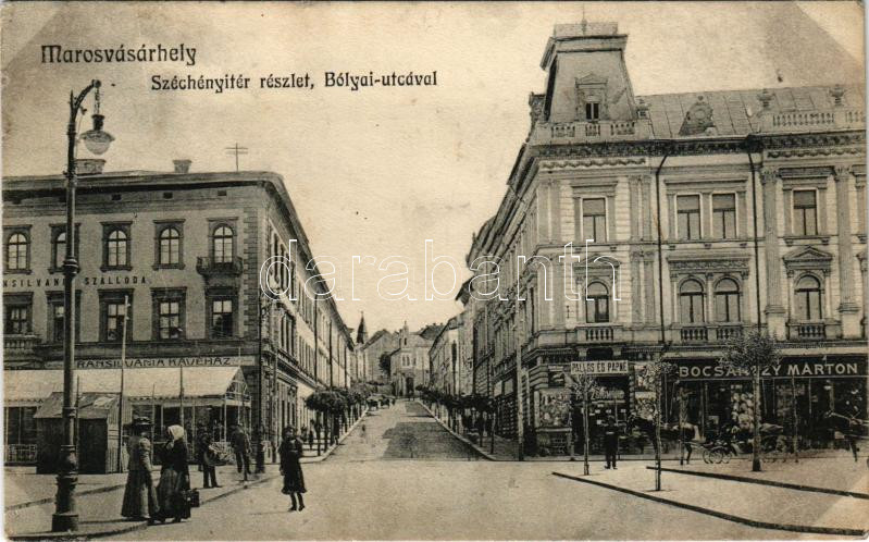 1914 Marosvásárhely, Targu Mures; Széchenyi tér, Bólyai utca, Transilvánia szálloda és kávéház, Pallós és Papné, Pál Zsigmond, Bocsánczy Márton üzlete. Porjes S. Sándor kiadása / square, shops (fl)