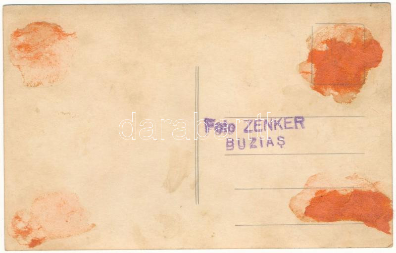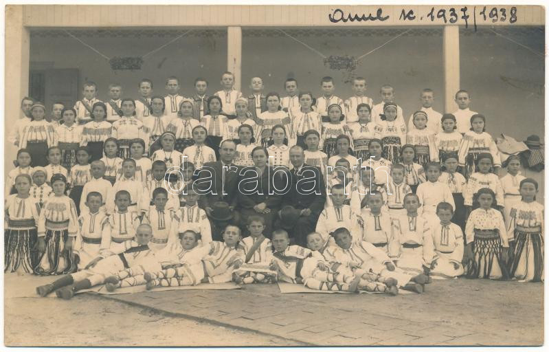 1938 Buziás, Buzias; iskolások csoportja népviseletben, erdélyi folklór / Transylvanian folklore, group of students in traditional costumes. Foto Zenker photo (ragasztónyom / glue marks)