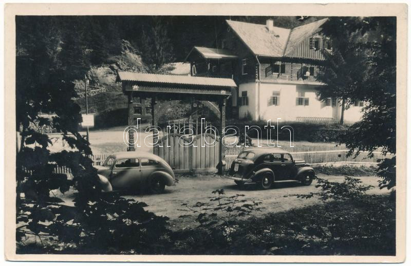 Leírás: 1944 Radnaborberek, Valea Vinului; üdülő, autók, székelykapu / spa, holiday resort, automobiles, Transylvanian carved wooden gate