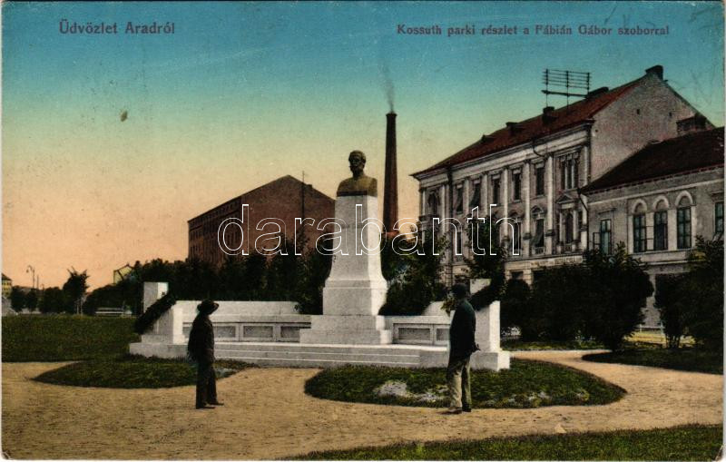 Leírás: Arad, Kossuth park, Fábián Gábor szobor, üzlet. Kerpel Izsó kiadása / park, statue, shop (fl)