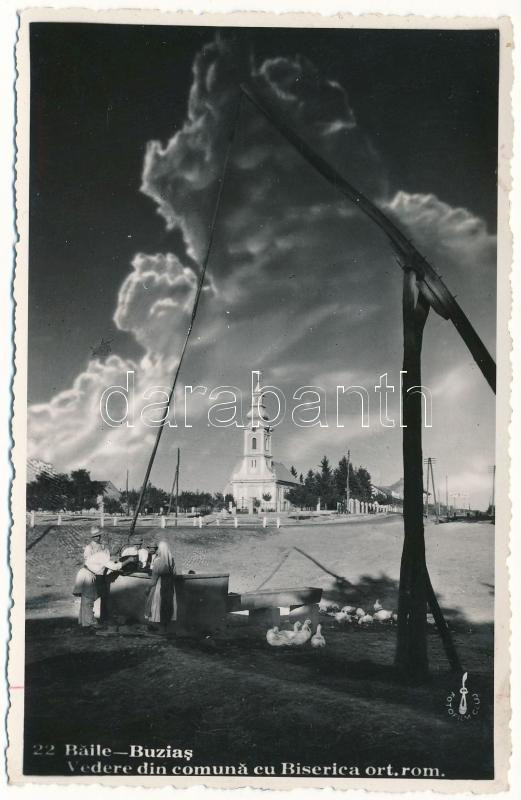 Buziásfürdő, Baile Buzias; Vedere din comuna cu Biserica ort. rom. / látkép, gémeskút, Román ortodox templom / general view, Romanian Orthodox church, Transylvanian folklore. Fotofilm Cluj photo