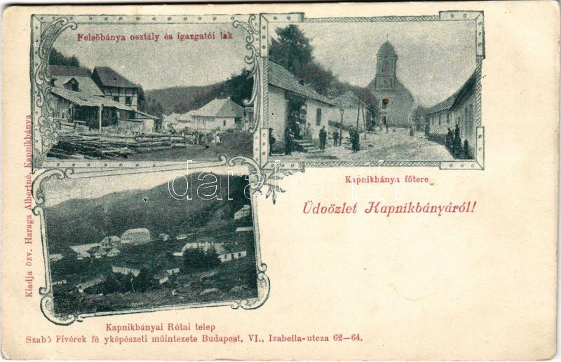 Kapnikbánya, Cavnic; Fő tér, Felsőbánya osztály és igazgatói lak, Rótai telep. Özv. Haraga Albertné kiadása / main square, mine directoriate. Art Nouveau, floral