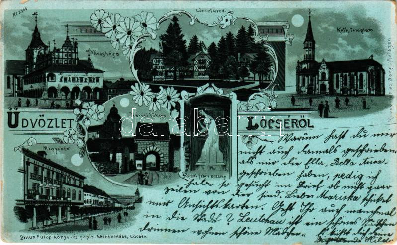 1898 (Vorläufer) Lőcse, Levoca; Városháza, Lőcsefüred, megyeháza, városi főkapu, katolikus templom, Lőcsei fehérasszony (Julianna Géczy). Braun Fülöp kiadása, Krecsmár és Sacz / town hall, county hall, city gate, Catholic church, Levocské Kúpele, spa. Art Nouveau, floral, litho (kopott sarkak / worn corners)