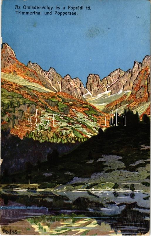 1917 Tátra, Magas-Tátra, Vysoké Tatry; Az Omladék-völgy és a Poprádi-tó. Cattarino S. utóda Földes Samu kiadása / Trimmertal und Poppersee / valley, lake (kis szakadás / small tear)