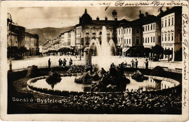 1932 Besztercebánya, Banská Bystrica; Fő tér, Tátra Bank, Hotel Rák szálloda, vendéglő és kávéház, üzletek, szökőkút / main square, bank, hotel, restaurant and café, shops, fountain (fl)