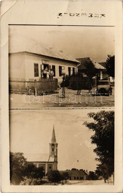 Leírás: 1938 Kéménd, Kamendin, Kamenin; Római katolikus templom, üzlet, atuó / church, shop, automobile. photo (EK)