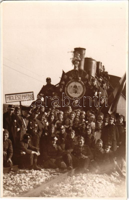 1938 Miglészpataka, Gemersky Milhost (Jolsvatapolca, Gemerské Teplice); bevonulás, katonák és honleányok a vasútállomáson, feldíszített magyar címeres gőzmozdony, vonat / entry of the Hungarian troops at the railway station, soldiers in front of a locomotive, train. photo (EM)