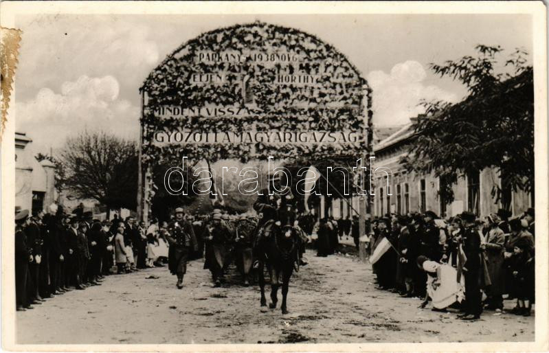 1938 Párkány, Stúrovo; bevonulás, "Éljen Horthy! Mindent vissza! Győzött Magyarország!" díszkapu, magyar zászló / entry of the Hungarian troops, decorated gate, Hungarian flag (fl)