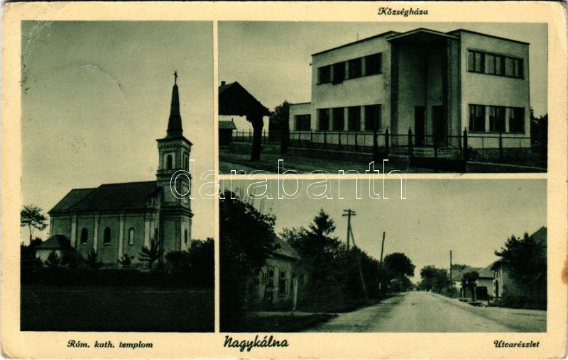 Leírás: 1941 Nagykálna, Kalná, Kálna (Léva, Levice); Római katolikus templom, Községháza, utca részlet / Catholic church, town hall, street view (EB)