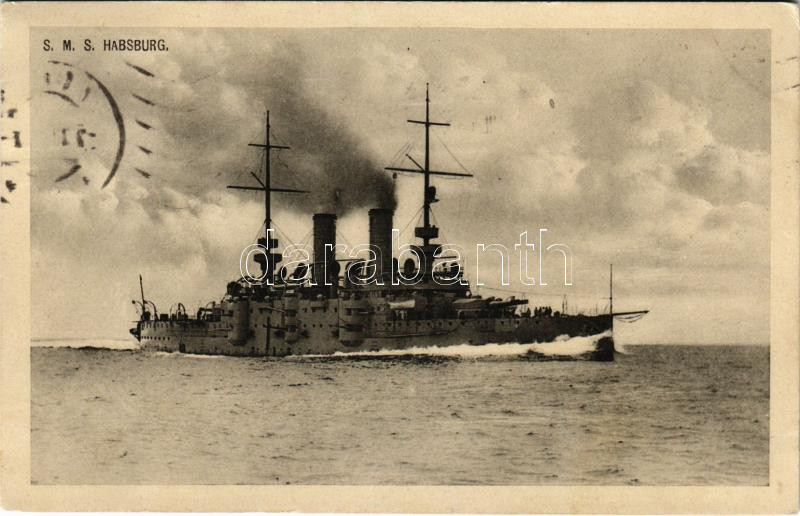 1913 SMS HABSBURG az Osztrák-Magyar Haditengerészet Habsburg-osztályú ... https://www.darabanth.com/hu/477-Gyorsarveres/477.0/Kepeslapok/Hadihajo~1500026/1913-SMS-HABSBURG-az-Osztrak-Magyar-Haditengereszet-Habsburg-osztalyu-pre-dreadnought-csatahajo~II3139972