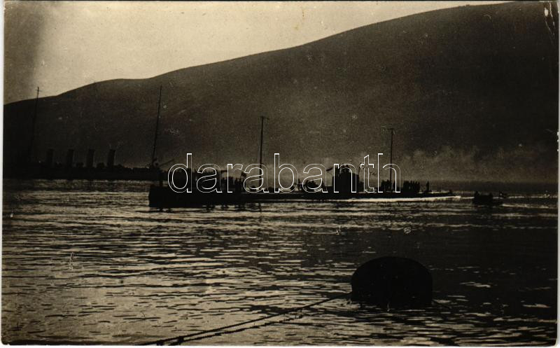 Első világháborús német tengeralattjáró osztrák-magyar zászló alatt a Kotori-öbölben / K.u.K. Kriegsmarine Unterseeboot / WWI German submarine under Austro-Hungarian Navy flag. photo (EK)