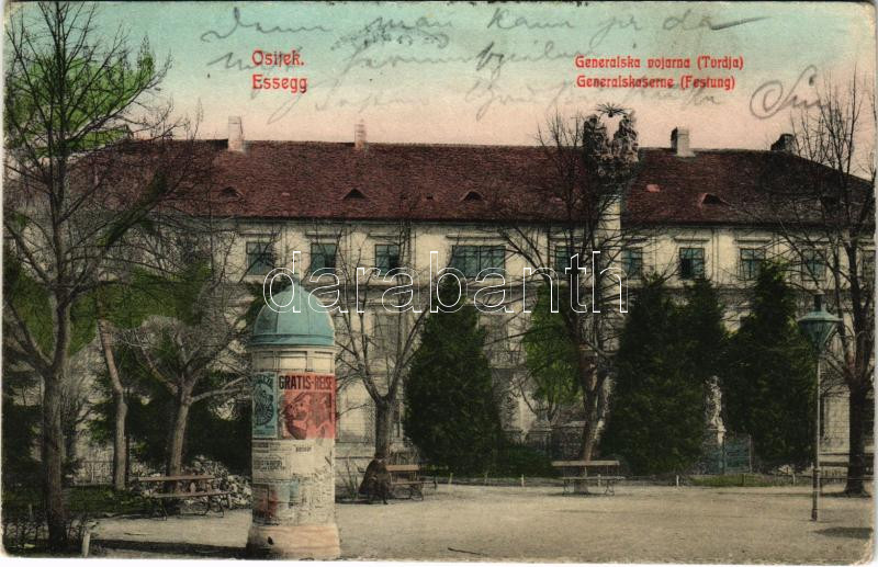 1907 Eszék, Essegg, Osijek; Generalska vojarna (Tvrdja) / Generalskase... https://www.darabanth.com/hu/477-Gyorsarveres/477.0/Kepeslapok/Horvatorszag~1500012/1907-Eszek-Essegg-Osijek-Generalska-vojarna-Tvrdja-Generalskaserne-Festung-KuK-milita~II3250072