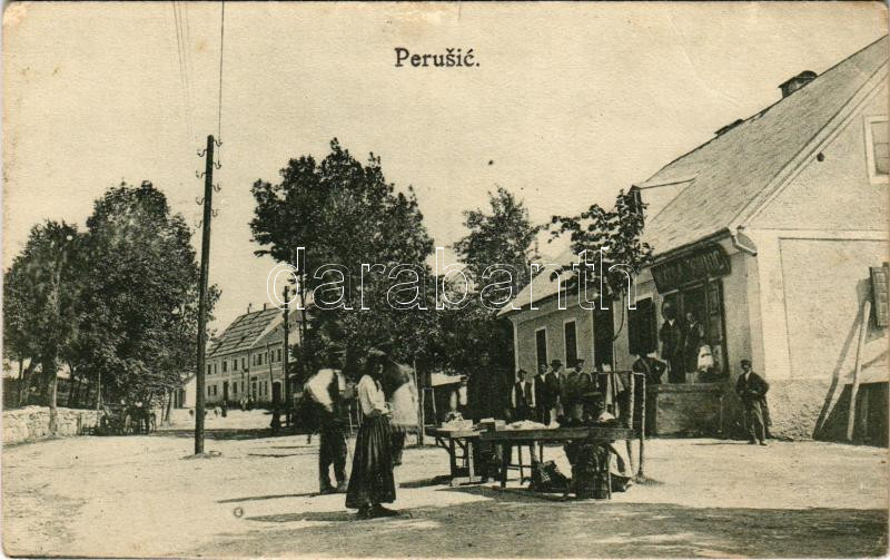 Leírás: 1921 Perusics, Perusic (Lika); Trgovina Anton Vlainic / Anton Vlainic üzlete, piac / shop of Vlainic, market (kis szakadás / small tear)